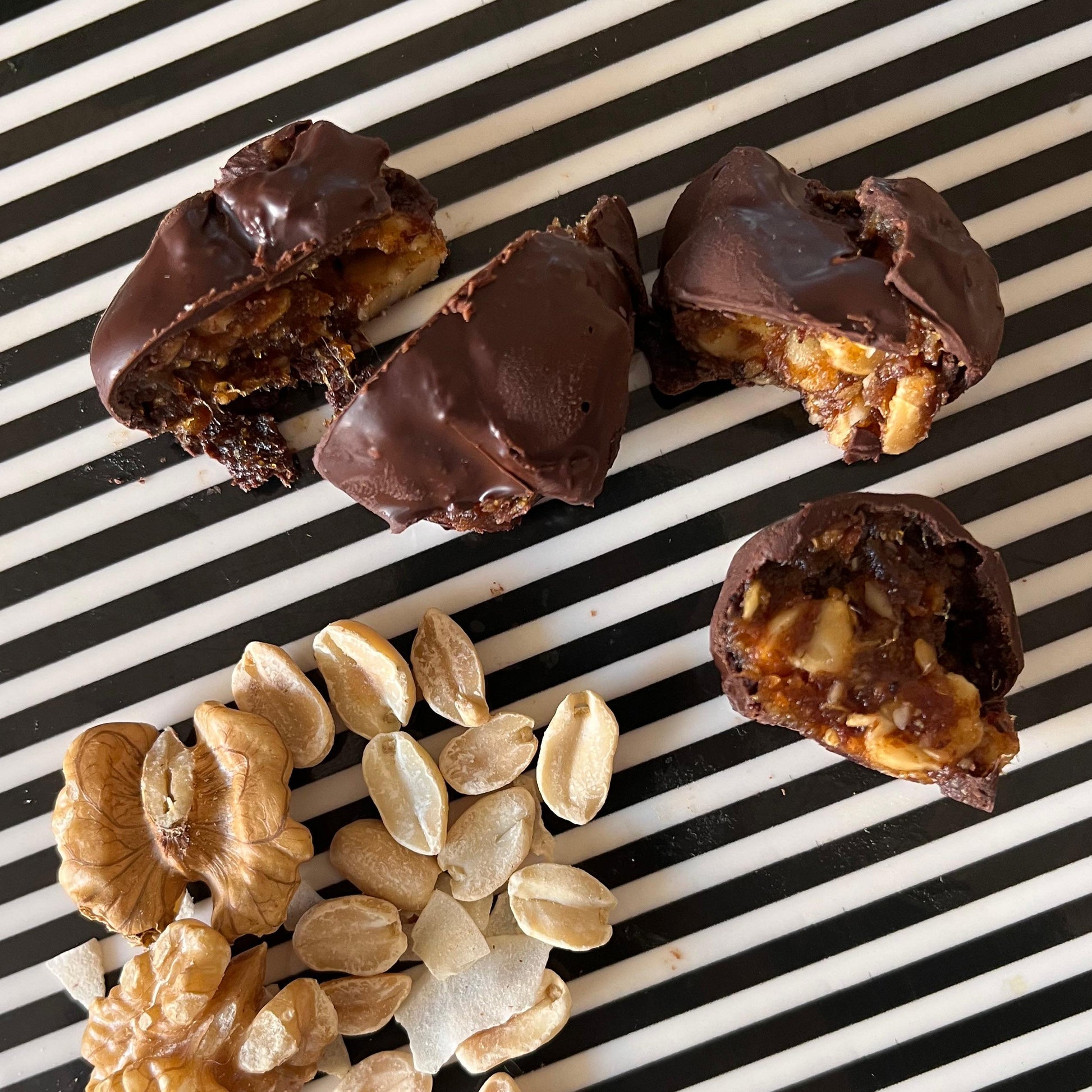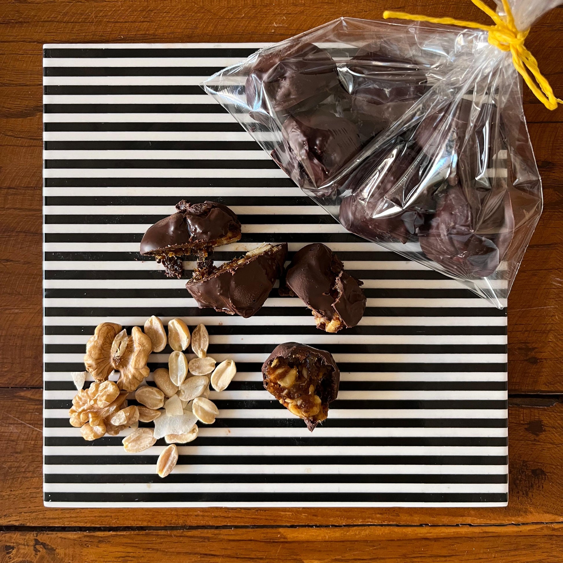 Bolitas artesanales de dátiles, maní en trocitos y mantequilla de maní, cubiertas en cacao semi amargo.