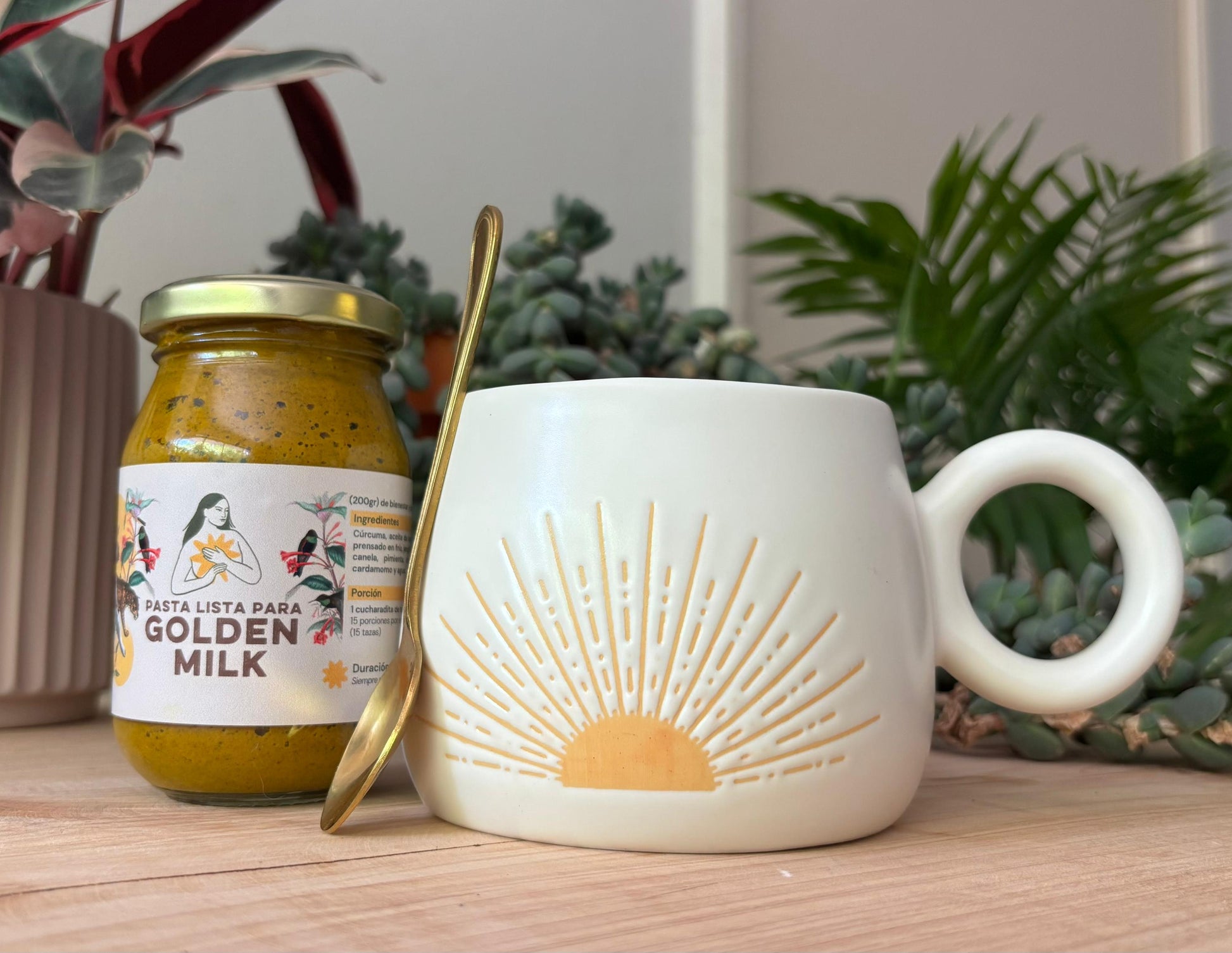 Tu frasco de Pasta lista para Golden Milk de 200g con una taza y una cuchara dorada! perfecta para preparar tu brebaje antiinflamatorio. Regala salud, regala un momento sagrado!