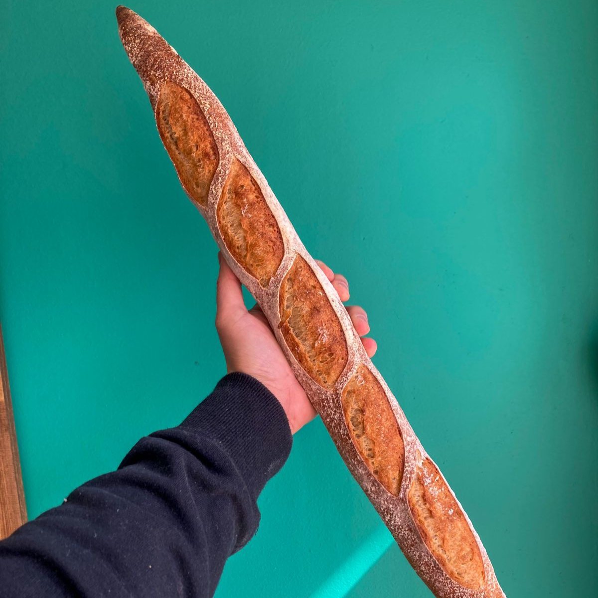 Baguette de masa madre y fermentación lenta. Mucho más digerible y con valor nutricional. Hecho con amor por nuestros amigos de Salvado.