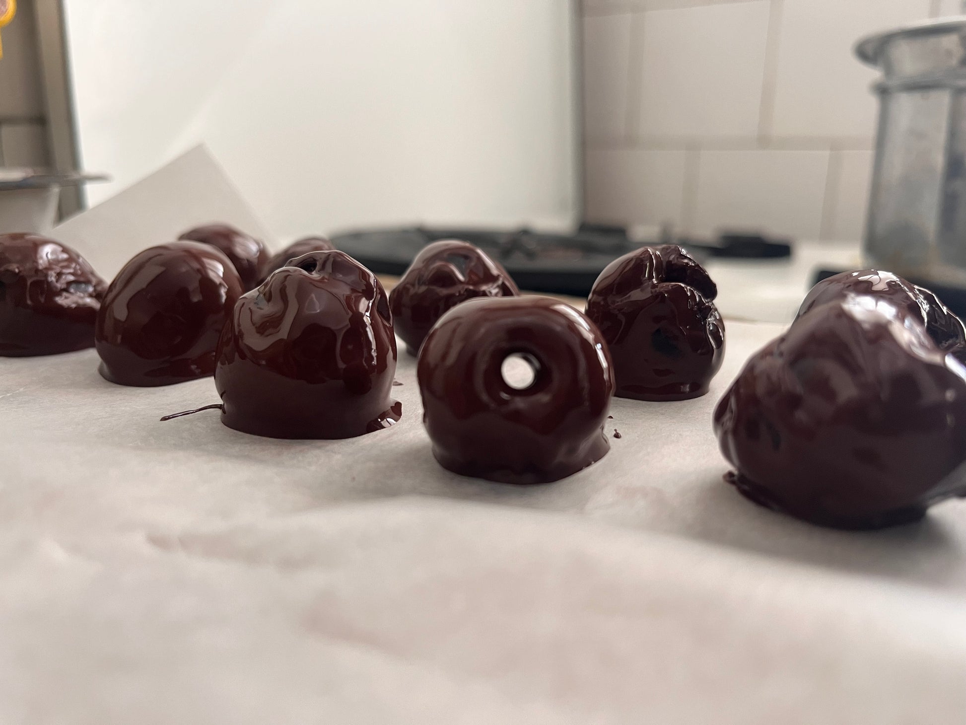 8 bolitas de cerezas orgánicas sin carozo cubiertas en chocolate 65% de cacao!