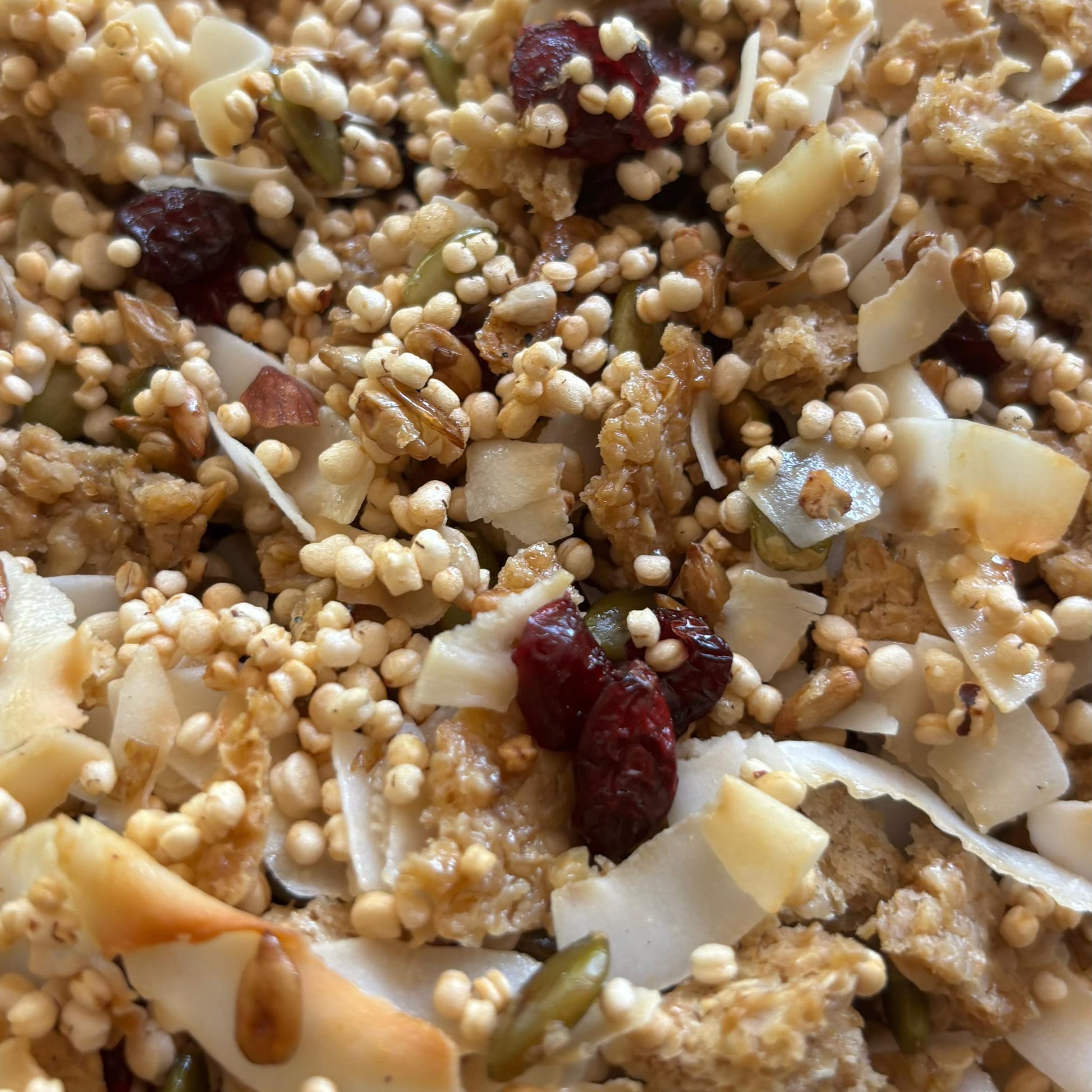 Contiene avena fermentada, almendras, pepas de zapallo, pepas de maravilla, cranberries activados. Hojuelas de coco, miel, aceite de coco y sal de Cahuil.