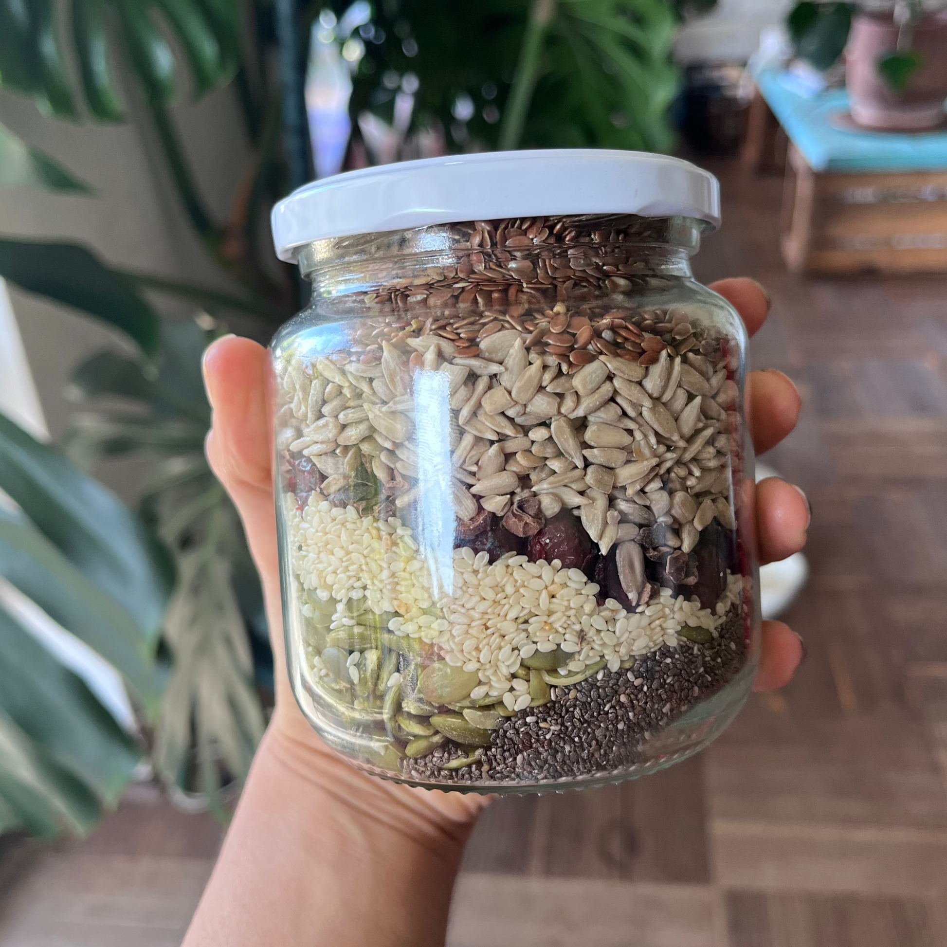 Mezcla de Linaza, Sésamo, Chía, Cranberries, Pepa de zapallo, Maravilla y Nibs de Cacao... buenísimo para tostarlas en el sartén y agregarlas en tu ensalada.
