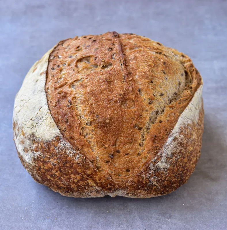 Pan de campo elaborado con masa madre y fermentación lenta, con semillas de sésamo, maravilla, linaza y 20% de harina integral , peso 850 gramos aprox.